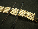 大ぶりのビーズネックレスを手首に数回巻いて輪をつくる。ネックレスの金具を上に向け、Uピンでネックレスをはさむ。髪はアップヘアーにする。