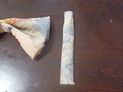 裏返すと細長い筒状の紐になる。これでリボンの中央部を巻く。