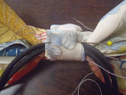 リボン中央に紐を巻く前に、ヘアゴムを挟んでおく。ヘアゴムの結び目が見えないよう何度か縫って固定する。