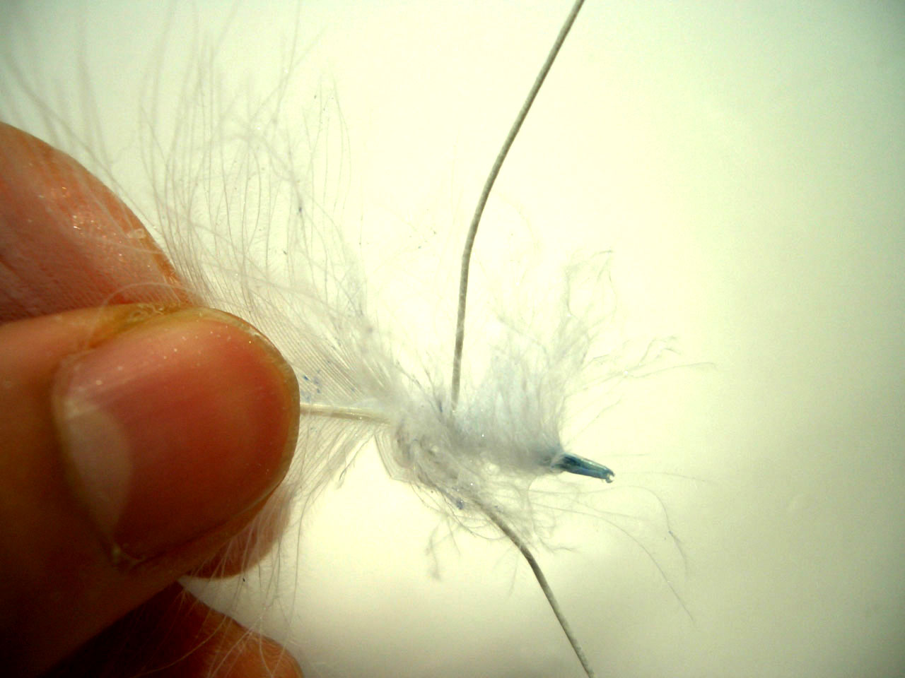 羽根の根元から2?位の位置に ワイヤー中央をあてる。片側のワイヤーを持ち、羽根にしっかりと2回巻く。