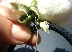造花でヘアゴムのワイヤー部分が隠れるように巻いていく。