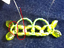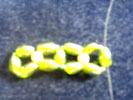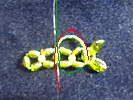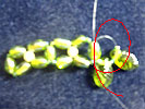 結んだテグスの左側をモチーフ下側の横向きインドビーズと丸小に通し、左端のインドビーズの位置まで通しておく。(緑のライン)