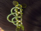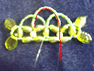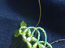 モチーフの下に出たテグスに丸小ビーズ・葉のビーズ・丸小ビーズ2個・葉のビーズ・丸小ビーズを順番に通し、インドビーズに戻す。