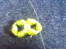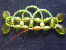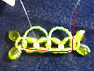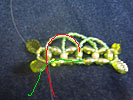 モチーフ下に出たテグスは、下側の横向きインドビーズと丸小を通して中央縦方向のインドビーズに通しておく。(緑の流れ)