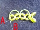モチーフの上に出たテグスには丸小ビーズを20個通し、左端のインドビーズに通す(B)。