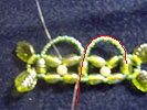 テグス右側はモチーフ中央のインドビーズに通して、更に左側の丸小ビーズ20個に通して補強する。そして インドビーズに戻しておく。(赤ライン)
