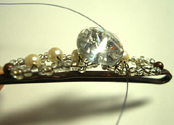 最後は丸小ビーズを3つすくい、ヘアピンの通し穴で交差。