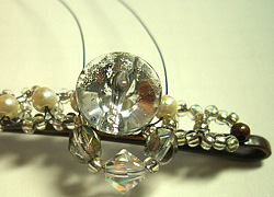 ボタンビーズ上の、5つめのパールにテグスをとおす。