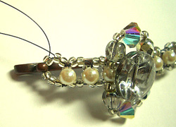 最後の輪は、左右のテグスに丸小ビーズを各3個とおす