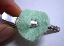 フェルトの穴にクリップを通す。ギザギザになっているクリップの上側を通す。