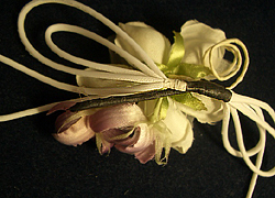 造花1とワイヤー#21を茎に入れたら、フラワーテープを巻く。