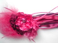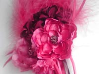 赤いドレスに似合うよう、3種類の羽根をカシス色に染めて使用しました。
