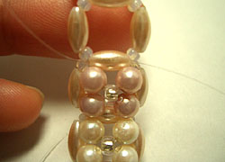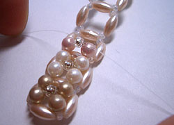 (B)左右のテグスに同色のパールを各1つとおす。土台のナツメで交差する。
