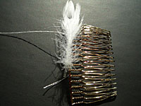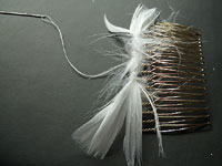 白糸を針に通し、コームと羽根の軸を縫い付けます。(白糸はそのまま切らずにおいておく)